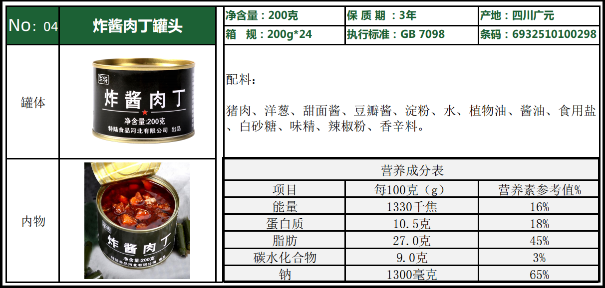 軍用罐頭,是軍用食品的一種,因其在常溫下可長期貯存,耐外界不良條件的能力強的特點而在軍用食品領(lǐng)域占據(jù)重要的地位,是保障士兵在野外持續(xù)作戰(zhàn)或執(zhí)行任務(wù)的必須裝備。
